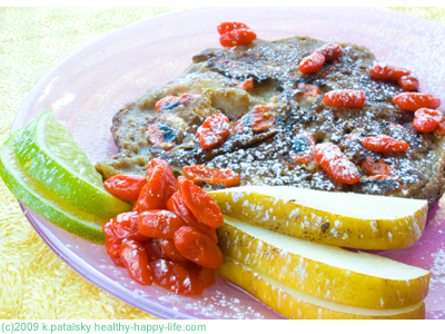 Goji pancakes! cool idea. goji maple syrup sounds good. So does a goji-lime flavor combo.