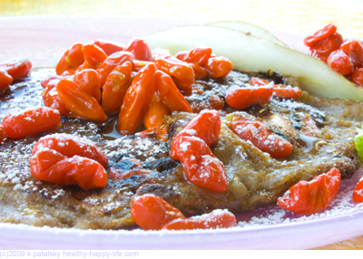 To serve: With a fork, strain out the goji berries and place over top pancakes. Serve maple syrup in a small pouring container for your diners. (Pouring too soon could make our pancakes soggy.) About 1 tablespoon of syrup should be plenty for a serving of pancakes. A light dusting of vegan powdered sugar is optional.