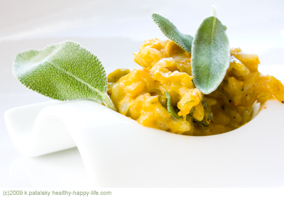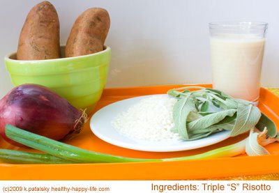 I refer to this recipe as my Triple "S" Risotto: Sweet Potato, Scallion and Sage. It is a bit creamier and bolder than a traditional risotto. The scallions, sweet potatoes, garlic salt and hint of cayenne really pump up the flavor. This is comfort risotto all the way. Plus it's healthy due to the generous amounts of copper, manganese, B vitamins, vitamin K, and Vitamin A in the ingredients.