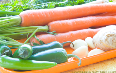 fiesta jalapenoThe second recipe is called Fiesta Jalapeno Carrot Ginger Soup. I've put a Mexican spin on the classic recipe. This recipe is BOLD! Lots of jalapeno, garlic, ginger and Serrano pepper flavor. Talk about an immunity boosting soup! This one will keep your body healthy and happy.