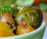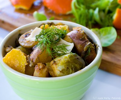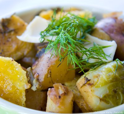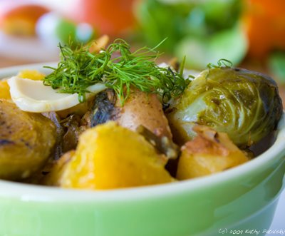 Hated Vegetable: Brussel Sprouts. My recent survey showed that brussel sprouts are one of the most hated veggies out there. So I'm going to be posting a few recipes that turn the haters into lovers. Who could possibly resist the cheesy dill potatoes part of this recipe....?