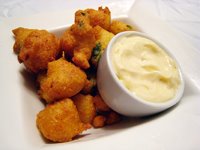 : Light fluffy cake-like fried nuggets. Not as spicy as I would have liked, but and excellent 'snack' to go with my rose champagne. (Made vegan)