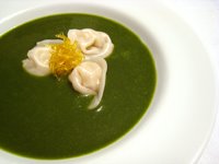 Spinach Soup with Smoked tofu-dumplings and lemon confit