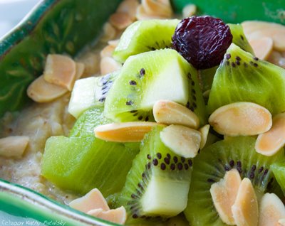 Creative Toppings. Oatmeal is like ice cream. You can top it a million different ways. My fave? Fresh cubed kiwi, dried whole Bing cherries and thinly sliced roasted almonds. Add a dash of cinnamon and some creamy soy milk and I am in oatmeal bliss.