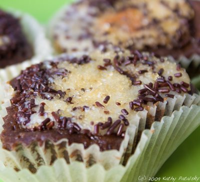 Black & White Cookies: NYC Treat. As an auxiliary cupcake option for the kids and adults at the party, I made "Black & White Cookie" Vegan Cupcakes. These cupcakes taste like a slice of NYC foodie style! NYC is famous for B&W cookies. My recipe combines a rich double chocolate cupcake with a 'graham cracker cookie crust' cupcake bottom. Then a black and white sprinkled white glaze frosting. I packed up the cupcakes and trekked them to the party, where not to my surprise... the vegan cupcakes were a big hit! And since there is no dairy in the cupcakes, I don't have to worry as much about the non-refrigeration transport time. Just one benefit of non-butter cream/vegan frosting.