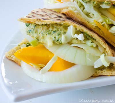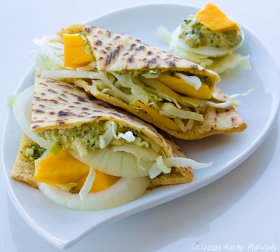 Add a few spoonfuls of pesto, a few slices of mango, and onion to each pita. Add as many greens to stuff the pita full. Serve in triangle pieces.