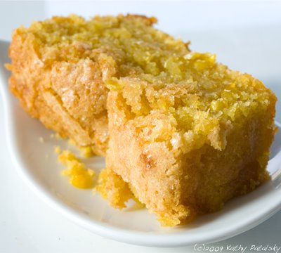 Corn Cake #1: Scoop-able. Spoonable. A super moist corn cake that you can, if desired actually scoop onto a plate. Holds up for a loaf slice, but very heavy from the high liquid level in the cake. Rich. Not crumbly.