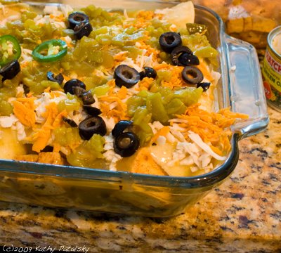And lastly, spread your mild green chilies over the cheese and sprinkle your olive slices on top of that. If you have any leftover jalapeno rings, you can place them on top as well.