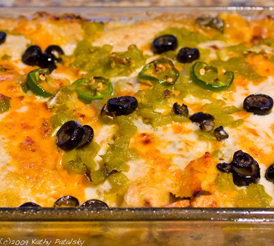 Place in a 350 degree oven for 35 minutes. Then uncover enchilada's and broil on high for an additional 5 minutes to brown and bubble the cheese top.