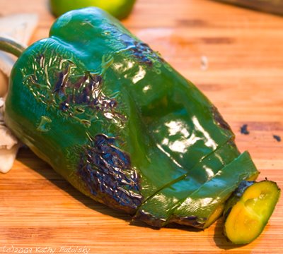Before we chop our poblano, bell and jalapeno peppers we want to roast - How to Roast a Pepper 101- them on the stove top. If you have a gas stove top you are in luck. Lightly roast each of the peppers. Remove any dark black charred areas and dice each pepper.