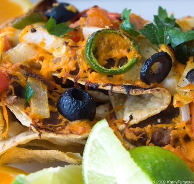 Nachos. Circa 1980. In the past, nachos have consisted of fried chips, thin greasy neon-orange cheese and sliced jalapenos-sometimes canned. More gourmet versions have included blue corn or gourmet style tortilla chips, piles of an exotic variety of cheeses, beans, sour cream, rice, cilantro and a variety of veggie toppings including onions and tomatoes. Not a 'healthy' food, and definitely not vegan. Until now...