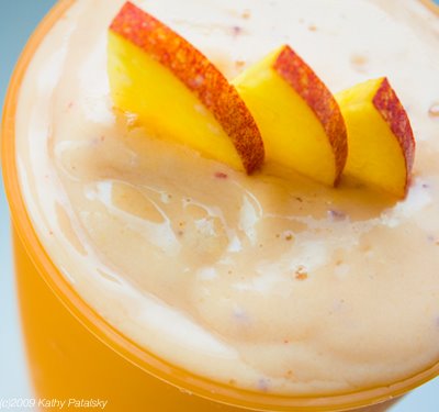 1. Blend all ingredients except the protein powder and fresh fruit (peach and if using, banana)