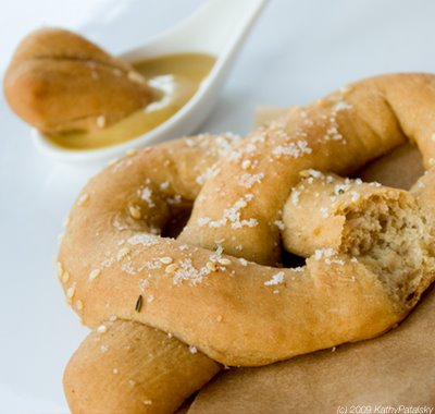 Brush each pretzel with a mixture of 2 tablespoon olive oil and 1 teaspoon lemon juice.