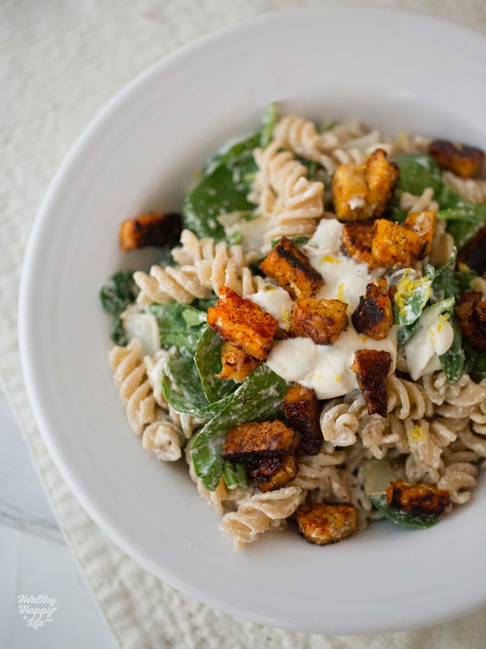 * Creamy Cashew Pasta with Tempeh Bacon