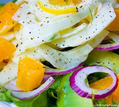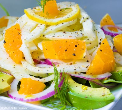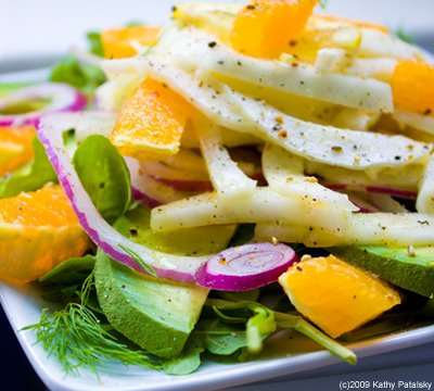 Citrus, Arugula, Avocado, Onion. OK, so the fennel is the headliner ingredient in this salad, but don't forget the delicious accent flavors that are included. Creamy avocado, spicy light arugula leaves, a thinly sliced red onion and a delicious layer of sweet oranges. A hint of lemon juice, olive oil and black pepper make this salad soar with summertime flavor.