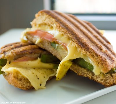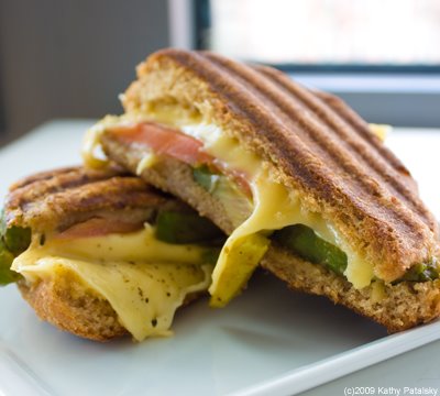 Taste Test: Smoky smell to the creamy Gouda. This is soy cheese? Awesome. The sandwich flavors are very simple and even the bite is very one-layered: soft. But still, I like it a lot. Usually I like a lot of big crunchy items like lettuce, raw onion or other thick veggies in a sandwich, but this tiny hot grilled panini goes perfectly with a frosty cold smoothie. So, it works-deliciously. The sea salt, pepper and olive oil are really all the seasoning this panini bite needs.