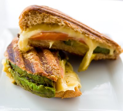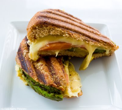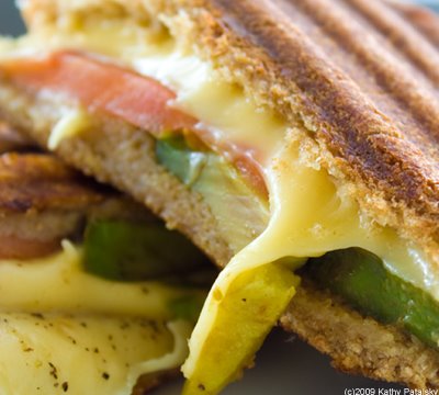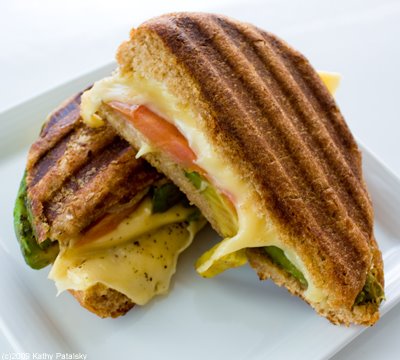Grilled Soy Gouda. Here is the menu description: "GRILLED SOY GOUDA (NY'S best kept secret) smoked soy Gouda cheese, plum tomatoes, avocado, extra virgin olive oil, sea salt on organic whole wheat bun."