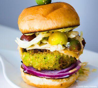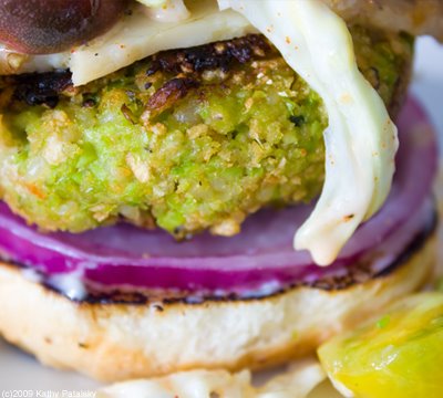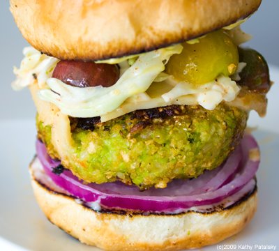 Mean and Green. This healthy soy burger combines a healthy edamame rice burger with a zesty spicy slaw salad. Add in a few tangy marinated heirloom tomatoes and a dab of Dijon and your burger is served! Don't forget the thick slice of red onion. You can use any type of bun you'd like. This burger is hearty enough for a grill or perfect for a stove-top saute pan. It only takes a few minutes to brown on both sides. This is a must try for all the greenies, veggies, vegans and edamame lovers out there. Take these patties to your next BBQ party and all your carnivore friends will be green with envy!!!