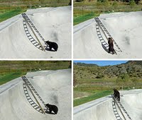 A happy story to round out your week. This poor little bear got caught in a skateboarding park ditch. Luckily, some nice human friends helped him out be placing a ladder in the ditch. And also luckily, this smarty bear figured out how to climb up the ladder! Smart bear. Cute pics.