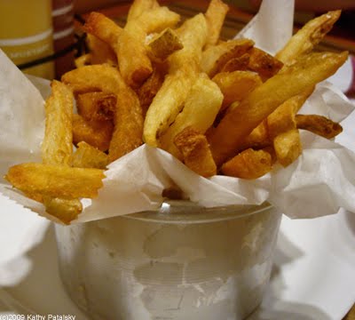 The Food: The salad looked, well, like a big salad I might get at a pizza place. Garbanzo beans, green romaine lettuce, balsamic dressing. It was served on a plate, which was a bit messy. The fries looked beautiful in a shiny silver can and wrapped in a strip of parchment paper. Crunchy and not over cooked-they looked and smelled fresh and delicious. The option for sweet potato fries instead of white made me super pleased.