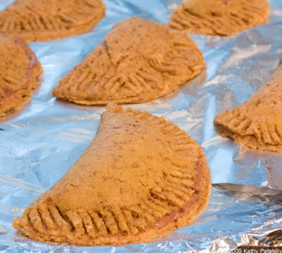 The Bad. The ratio of crust to filling was a little off. I was rushing a bit and didn't roll my dough out thin enough. A thinner dough would've allowed me to pack more filling into each pocket. So thinner dough for a thinner crust is a big change I will make for next time. Also, I used all whole wheat flour in the dough. This made for a hearty, nutty flavor, but browned and heavied the crust a bit too much. I might change up the flour a bit and use half whole wheat and half white. Or perhaps use all spelt, or some garbanzo-fava flour. Experimentation is wide open for this recipe. I also over-baked these little pies a tad. Watch out for that. Ten minutes should do it.