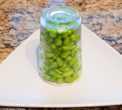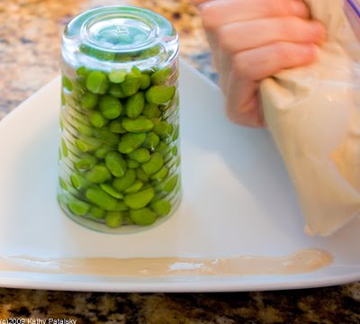 4. Grab your glass. Fill your clear juice glass with about 1 cup of beans-or enough to reach the brim of the glass. Pack them in tightly. If you'd like, you can grind a bit of fresh black pepper over the cooked beans before packing them into the glass. Depending on whether you like the taste of cold or warm beans better (I like cold edamame best). If you need to cool off just-cooked beans, stick them in the fridge for a few minutes.