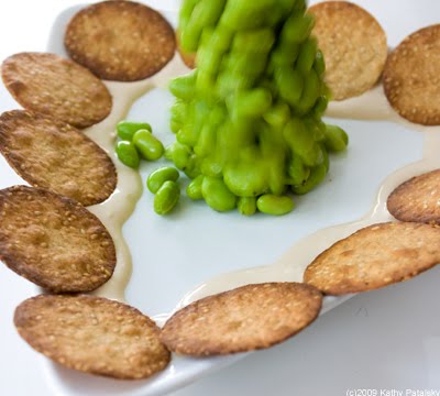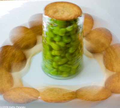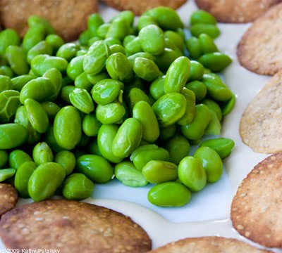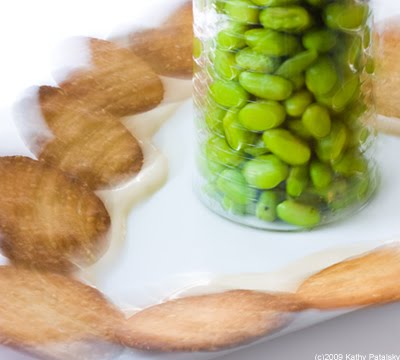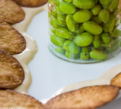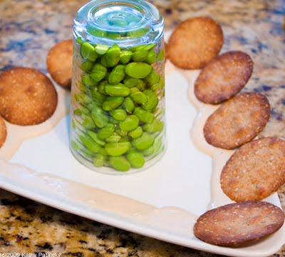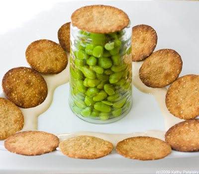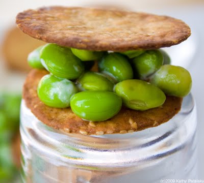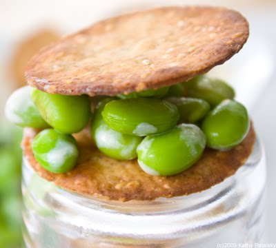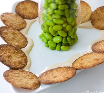 Healthy Space Snack. This snack is healthy because it contains protein-rich soy beans, crisp low-fat or fat-free rice crackers and a yummy vegan cream cheese based dipping sauce. You can use any variety of rice cracker: sesame, plain, wasabi, seaweed, spicy, vegetable, black sesame or brown sesame like mine. But the main ingredient is the star of the show: soy beans! Soy beans are rich in essential amino acids (complete chain proteins), fiber, essential fatty acids and soy isoflavones. It's not as easy as some people think to get kids (or adults!) to down those little green soybeans. This will assist you in that task. And if your family is already an edamame-fan, this snack is a fun way to perk up your bowl of edamame!