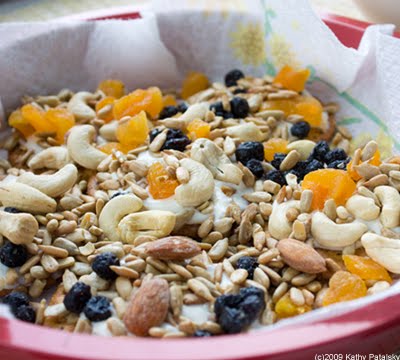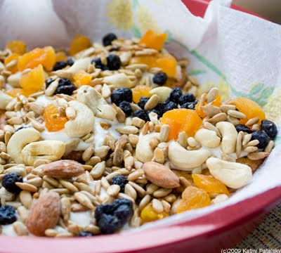 1. Make your Trail Mix sprinkle bowl. Optional ingredients include fruit/nuts/seeds. A few ideas: dried apricots, dried blueberries, salted sunflower seeds, almonds, cashews, poppy seeds, pumpkin seeds, dried cherries, dried figs, sesame seeds, goji berries, shredded coconut, dried cranberries, walnuts, pecans, Brazil nuts, pistachios and hazelnuts.