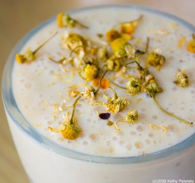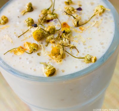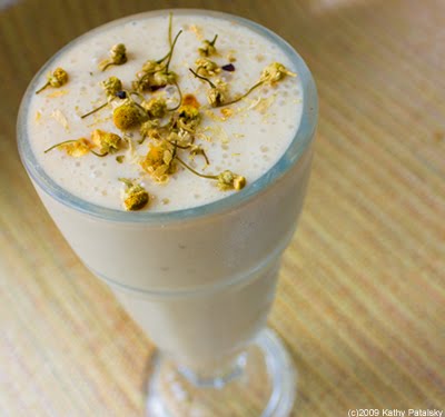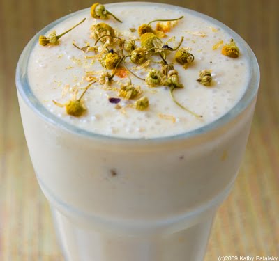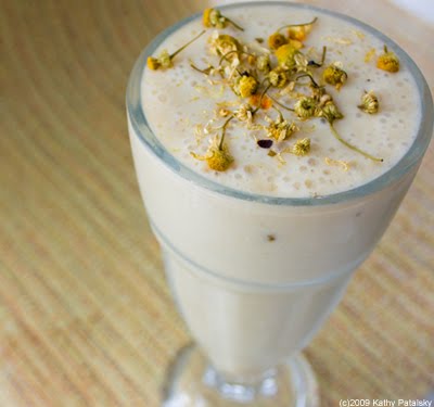Calming Effects. This smoothie has a plethora of calming ingredients including: chamomile tea and flower garnish, bananas, vanilla, yogurt, coconut water ice cubes, cinnamon, and soy milk. The chamomile really infuses this entire smoothie with a sweet soothing aroma, accented by warm cinnamon and luscious vanilla undertones. The key ingredient in this smoothie is the pile of bananas you will be using. Gentle on the tummy and sweet to your taste buds. Be sure and use ripe bananas. Organic ingredients always preferred. Here's the recipe....