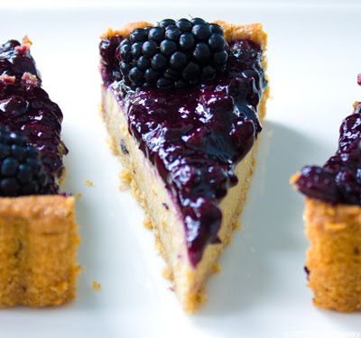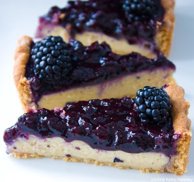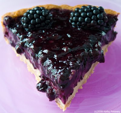 "A pair of little change of season pies, using the last local berries of summer and the first local sweet potatoes of fall. The first pie is a summer ending blackberry/blueberry vegan cheesecake. The cheesecake is in a lightly spiced brazil nut crust, with a citrus infused filling and a topping of blueberries and blackberries. The second pie is an early autumn sweet potato pie. The crust is again the spiced brazil nut crust. The filling speaks for itself -- a sweet creamy blend of sweet potato and spices." -Barbara, Gone Pie Vegan Bakery