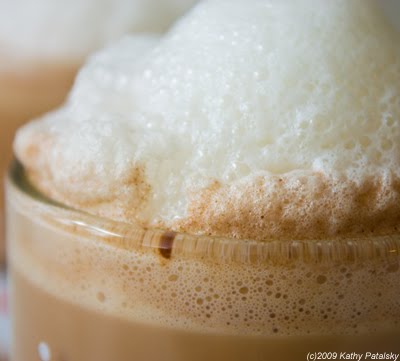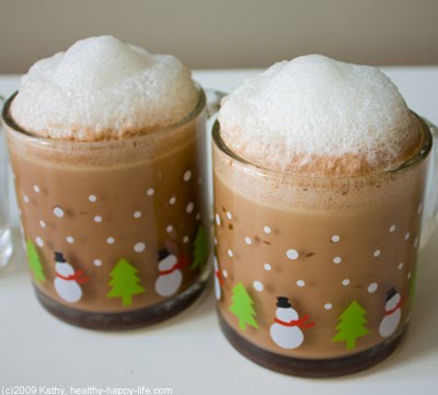 4. In a separate glass mug add the frothy foam ingredients. Heat to about 60 degrees in the microwave. About 40 seconds for my micro. Using an aerolatte wand milk frother, froth the milk until it is nice and foamy. You can also use a steam-foamer or other kitchen gadget you may own. If you do not have a foamer, simply heat the milk and stir it very briskly for about 30 seconds.