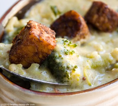 I've been feeling inspired by beautiful bunches of bright green organic broccoli lately. And since it's winter and everyone is better off with something warm in their tummies, I decided to craft a hearty, chunky and incredibly satisfying vegan soup. This recipe is a keeper: Broccoli Jack Soup, with Spicy Maple-Chipotle (Map-oltle) Tempeh Croutons on top. It's perfect for lunch or dinner. Protein, veggies and the perfect amount of vegan cheese. Dive in, it's delicious...
