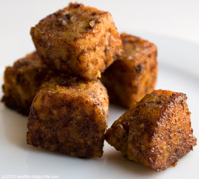 10. TEMPEH CROUTONS: Add the maple syrup, oil and apple cider vinegar to a saute pan, on high heat. Add your tempeh cubes. Dash your chipotle pepper powder over you cubes and saute until they brown on all sides. As your pan gets dry, add in a few splashes of water and allow the steam to cook and hydrate the croutons a bit. Saute until they are tender, yet a bit crisp on the edges. Set aside and use as topping for soup.