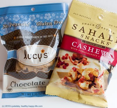 Taste test! New treats indeed - Starbucks has set up a huge "snack station" - a bunch of straw bins filled with dried fruit, exotic gourmet nuts, crackers and cookies - all in snack-sized pouches. I spotted the Lucy's brand vegan cookies and snatched a chocolate chip flavor. There were about 3 flavors to choose from. I then snatched a Sahale Snacks Cashews sack, two canisters of tea and headed for the register. I politely asked the cashier if they still carried almond butter for the bagels. She giggled and said "Huh? No." Hmm. Have they really ditched the healthy Justin's brand almond butter? Sad. I love that stuff. So anyways, I rushed home to taste test the snacks and teas, but did they past my health-minded taste test? Find out...