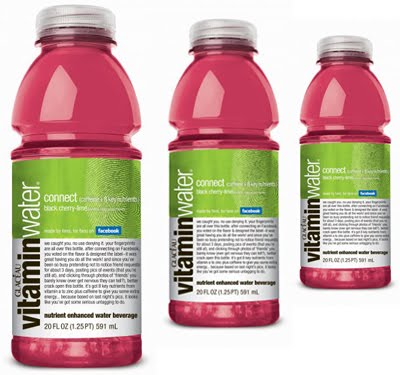 Connect. Vitamin Water's latest marketing ploy is it's new Facebook-inspired flavor: Connect. It's "made by fans, for fans." This black-cherry lime flavored water boasts "8 key nutrients" and added caffeine. Added caffeine? Haven't we passed that Red Bull, I need energy now, triple shot at Starbucks trend? I hope so. And as one Facebook commenter, Skipp, noted "I feel like the caffeine kind of goes against what vitamin water is all about...."