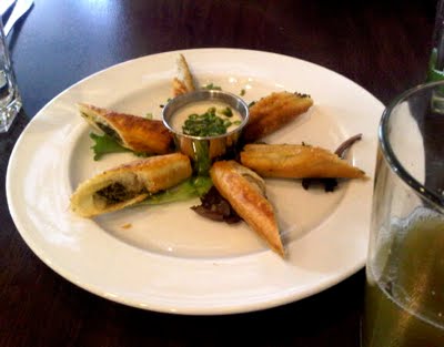 I could see the urban oasis in the fuzzy distance. Like a golden shimmering mirage in a heated desert. Walk sign: go. I hurried my legs to the doorstep. I scanned the menu stuck on the outside of the door - my focus fuzzy, the text blurred, taste buds dazed. Mushroom flutes with cashew cream??? My taste buds woke up the rest of my body parts "Get up, gt up! We are eating now!" Open door: insert self. Waiter? Table for two please...