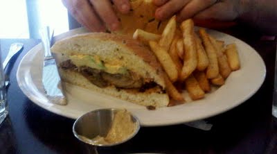 My husband's southern seitan sandwich was awesome. I took a few bites of seitan. Spicy, crispy, yummier and healthier than any 'meat sandwich' you will ever eat. My husband, who FYI for newbies, is not vegetarian, love, love, loved it. Fries were tasty too. Lightly spiced. He asked for dijon mustard on the side. The waitress found some for him.