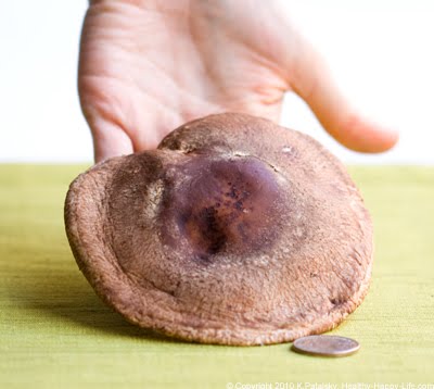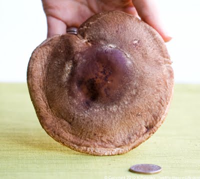 How Big? This hefty shiitake is as large as a portabella and stretches over 4 inches wide. It towers over a quarter coin. It's the biggest shiitake I've ever held in my hands. Almost too beautiful to eat! Almost.