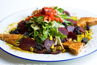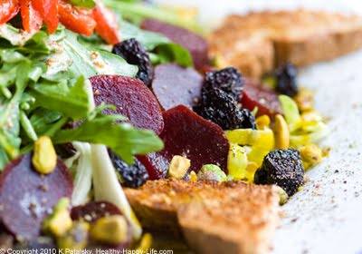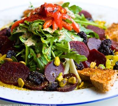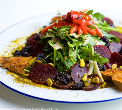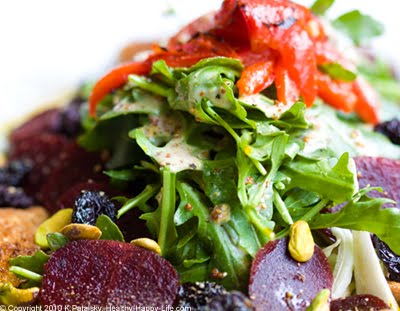 My Spring Cherry Blossom Salad celebrates those blooms. I've added a sprinkle of spring green pistachio nuts against a background of dark pink beets, sweet dried bing cherries and bright red roasted bell peppers. Top it off with a creamy spicy Dijon Dressing and a few triangles of sprouted grain toast on the side for a fleur-fect spring salad. Recipe...