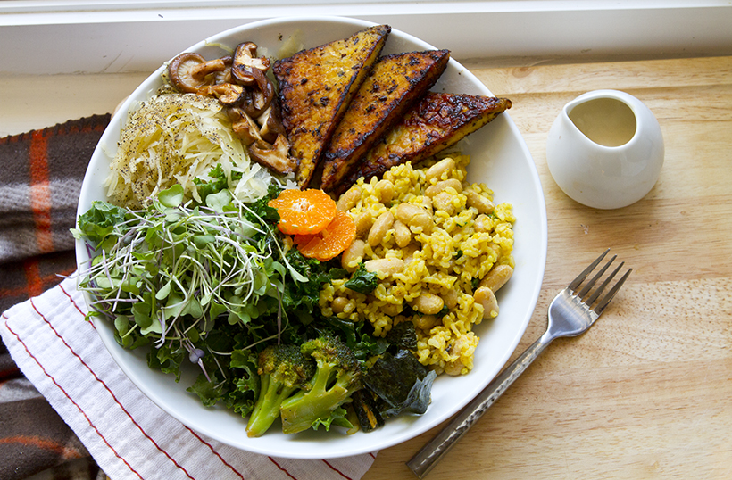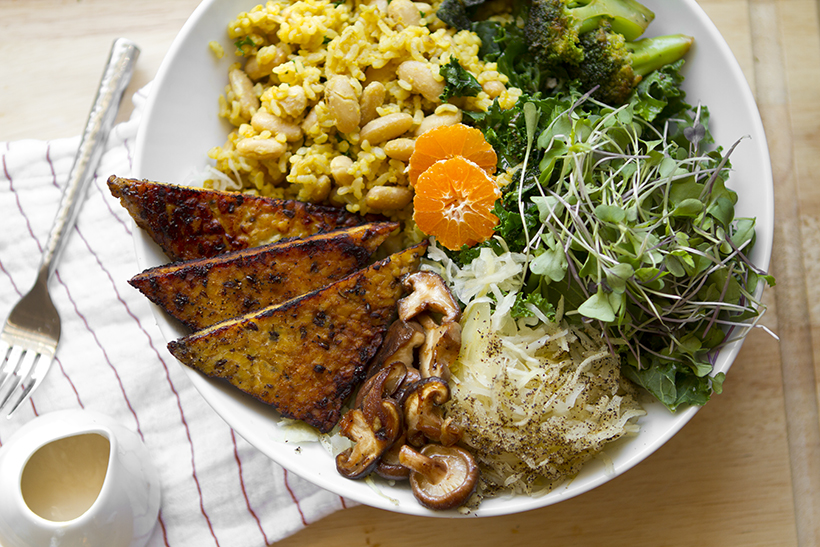 This meal in a bowl includes tempeh, sauerkraut, shiitakes, rice and veggies. This is a casual take on a macrobiotic meal.
