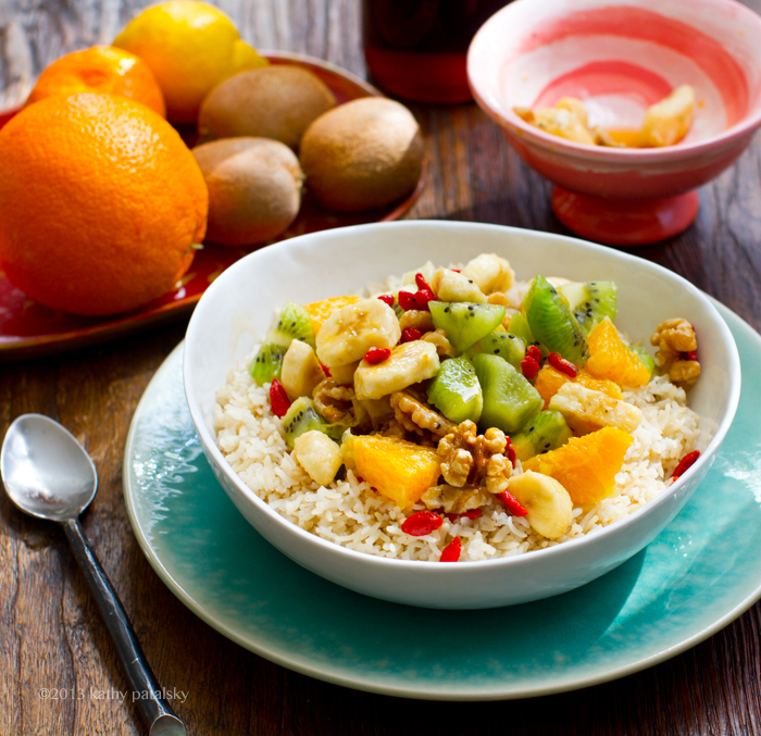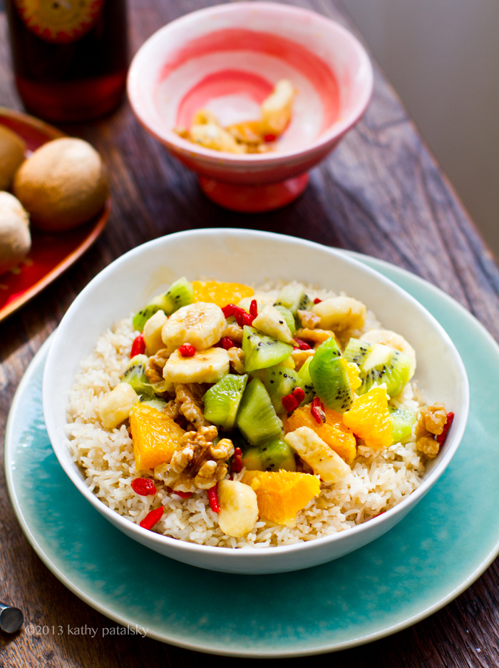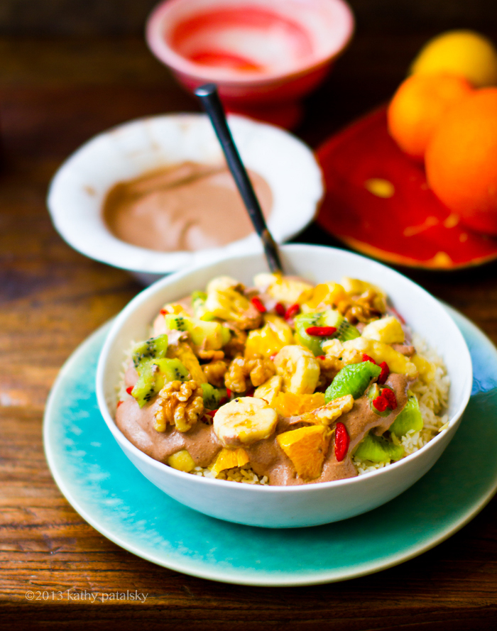 4. Serve! Add the grain base (warm rice) and top with the cacao puree and as much fruit salad as you'd like.