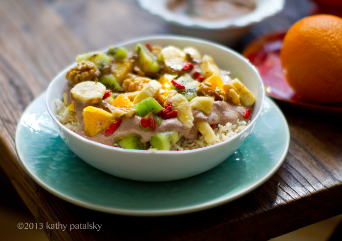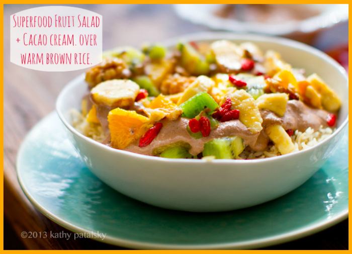 Super Food Fruit Salad + Cacao Puree. Over Warm Brown Rice.