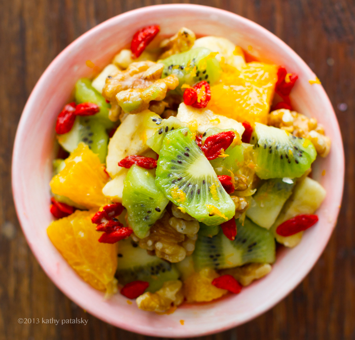 The fruit is bursting with antioxidant bliss. Vitamin C galore. Fiber. Potassium and more. This salad boosts wellness is a variety of ways including immunity-boosting and anti-aging/ free-radical fighting power. Plus all that sweetness provides a natural burst of energy. (And since there are healthy fat nuts in there too, you are slowing down digestion so that your blood sugar doesn't spike and crash.)