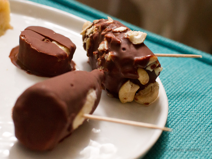 - First make your banana bites, these are easy to make and will be ready in about ten minutes. You need to use frozen bananas so that the chocolate freezes / hardens easily on the bananas. Pull pre-sliced frozen bananas from the freezer. In a small bowl, add the chocolate chips and coconut oil. Melt in microwave. Start dipping your bananas in the chocolate. I used toothpicks to help me dip. Then dip the bananas in optional crushed nuts. Place the dipped bananas on parchment paper or a greased freezer-friendly plate. Place in the freezer and they should be nice and frozen in 5-10 minutes.