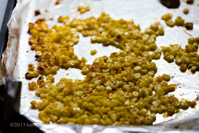 2. Slice the kernels off your corn and toss them in the sunflower oil. Add the oiled kernels to a greased baking sheet. Season on top of the kernels.