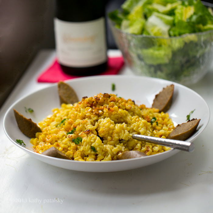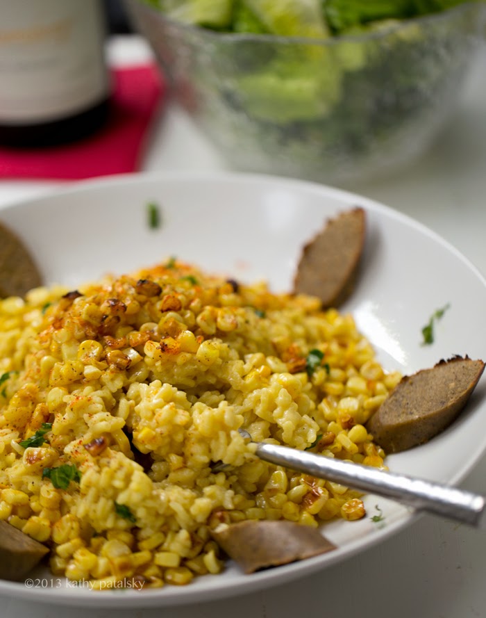 3. Place the corn in the oven and bake for about ten minutes. Then turn oven to broil and broil for another 2-3 minutes - watching closely so the kernels do not burn (or start popping! As one of mine did.) When the kernels start to blacken around a few edges, turn heat off and let them sit in the hot oven while you prepare your risotto. **If adding "Beer Brats" you can slice and bake in the oven alongside the corn.