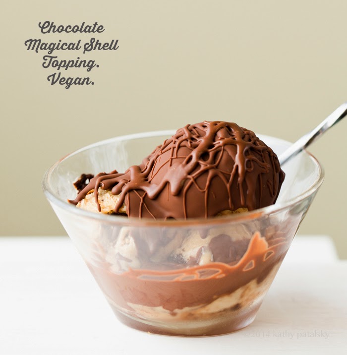 Magical Shell. Melty chocolate with a hint of coconut. This veganized dessert topping is rich and amazing, and totally dairy free. Nothing added and no chemicals or preservatives. Just make sure you start with some high quality vegan chocolate chips, crushed vegan chocolate bars OR try my raw version. Let the magic begin..