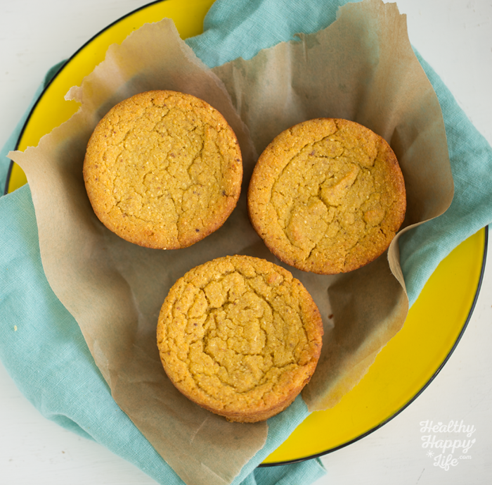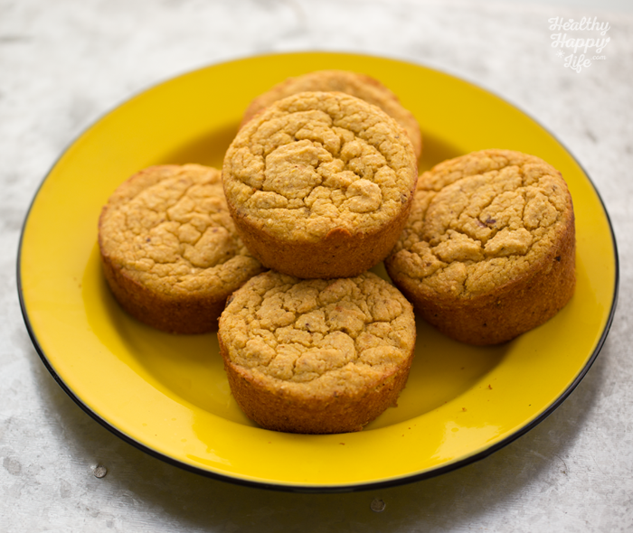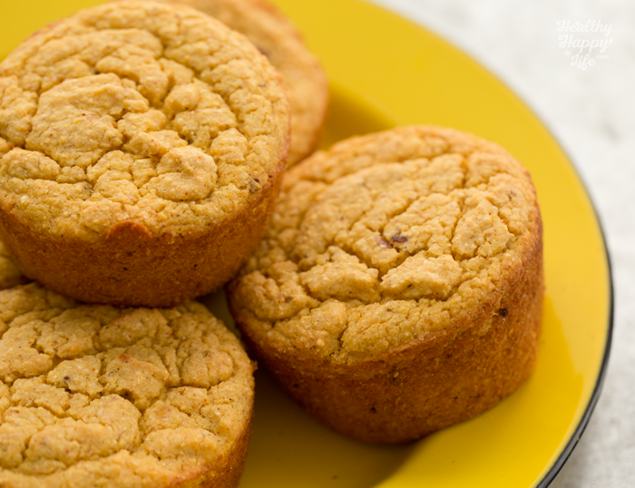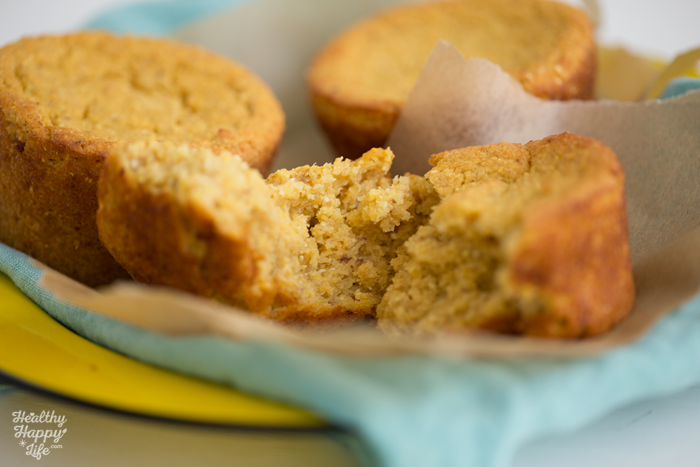 The sweet corn adds enough natural sweetness to these savory-sweet muffins, but if you want a bit of added natural sweetened feel free to toss in two Medjool dates to the blender for the liquids.