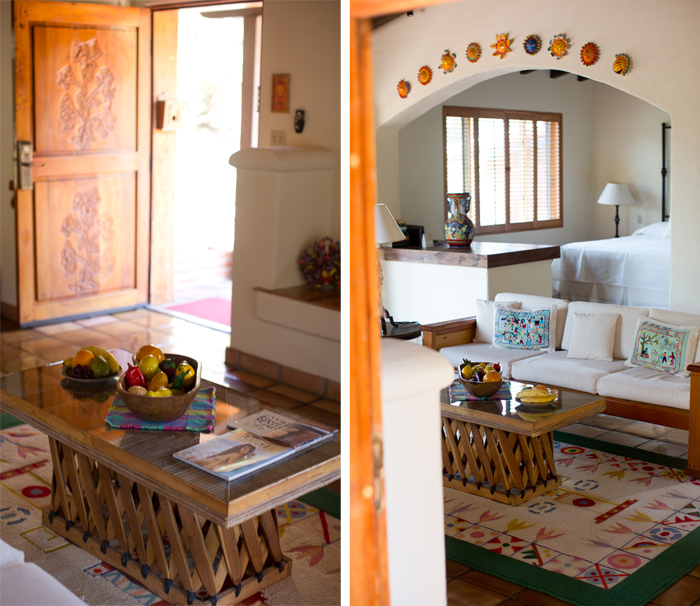 The rooms at the ranch are gorgeous, with classic Mexico-themed accents. Cool, soft tile floors, colorful accents, large bathroom, private sun lounge area overlooking the mountain, fresh fruit, and comfy beds.