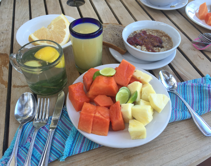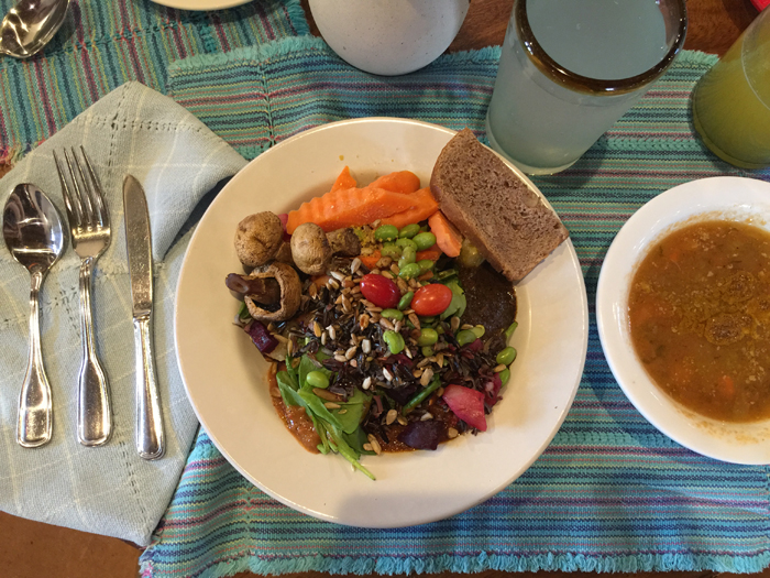 Basics: The menu served is actually mostly vegan! LOADS of plants with occasional offerings of fish and cheese/dairy. No meat is served. You will eating loads of plants, nuts, grains, legumes and herbs. Quinoa, beans, oats, fresh fruit and veggies, nuts, seeds, nutritional yeast, fresh juices, tea and more..!